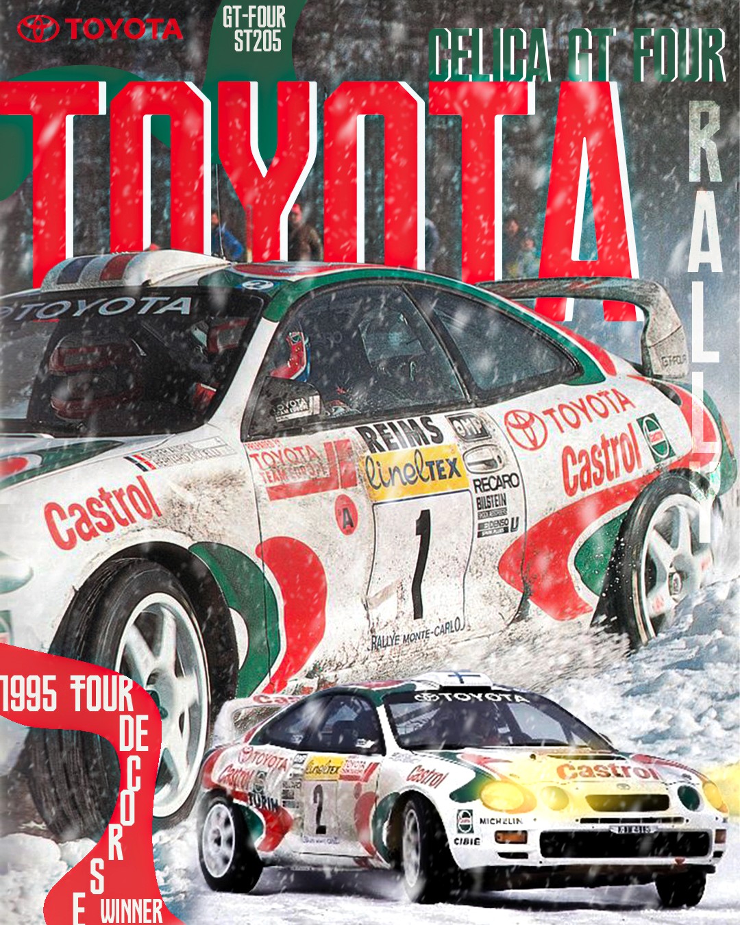 Before modern aero and hybrid engines, there was the pure, turbocharged grit of the 90s. This artwork is a high-speed tribute to one of rallying's most recognizable machines: the Toyota Celica GT-Four ST205.